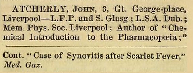 John Atcherley was, to begin with, an apothecary, or a chemist and druggist. Some of the earlier medical directories in which he appeared credited him with the qualification “L.S.A. Dub.” (as in the above entry in the British Medical Directory of 1853) or “L.S.A. Dublin” – Licentiate of the Society of Apothecaries, Dublin.