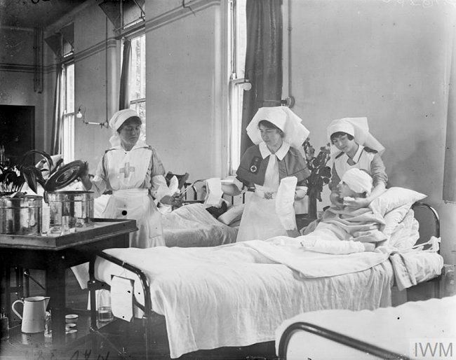 Picture credits. VAD poster: Image from Wikimedia Commons; likely to be copyrighted, but copyright owner unknown – ‘fair use’ exception claimed. VAD Nurse Violet Alicia Aplin: Adapted from a public domain image at europeana. Nurses, assisted by a VAD nurse, with patient in WW1: Photo © IWM (Q 18950), taken from the IWM website and used under the terms of the IWM Non Commercial Licence.