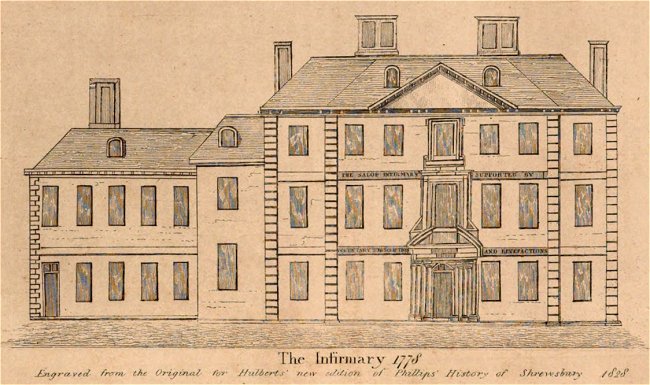 The edifice is a plain handsome brick building, well adapted to the purposes of the institution, being situated on the verge of an eminence, which commands every advantage of salubrious air, and, what is, perhaps, in no small degree favourable to convalescents, delightful prospects. Its internal economy, and the gratuitous attendance of its medical supporters, enable it to challenge a comparison with any provincial establishment of the same kind. — Joseph Nightingale (1813), A topographical and historical description of the County of Salop.