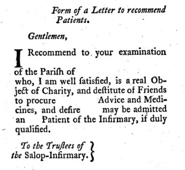 This mismatch between the supply of, and demand for, hospital beds invites the question of how decisions were made regarding those who were to be admitted the infirmary as in-patients. As we have seen, the original proposal upon which the movement to open the institution was founded was for “an Infirmary for the Poor-Sick and Lame” of Shropshire and its neighbourhood. Accordingly, rule 46 of the Rules and Orders for the Government of the Salop Infirmary (published in 1746) specified “That no Patients be admitted who are able to subsist themselves, and pay for Medicines.”