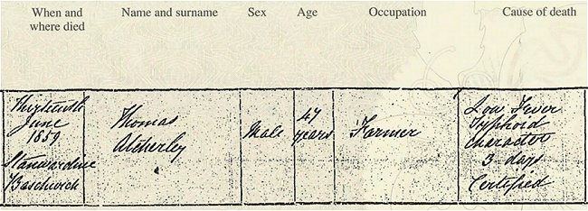 The Atcherley family was dealt another blow within four years of Jane’s demise. Having survived trials of water (in 1839) and fire (in 1849), Thomas was killed on 13 June 1859 by a low fever of “Typhoid character” which he had suffered for three days. He was 47 and, by that time, the only Atcherley still farming at Stanwardine. His death not only left the future of the Atcherley farm hanging in the balance, it also left his five children, whose ages ranged from 10 to about four, as orphans.