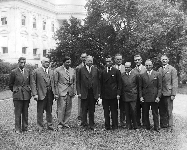 “The foreign delegation of noted aviators who are here to participate in the air races at Cleveland […]” – Acme Newspictures (Atcherley stands behind President Hoover)